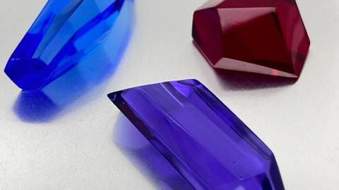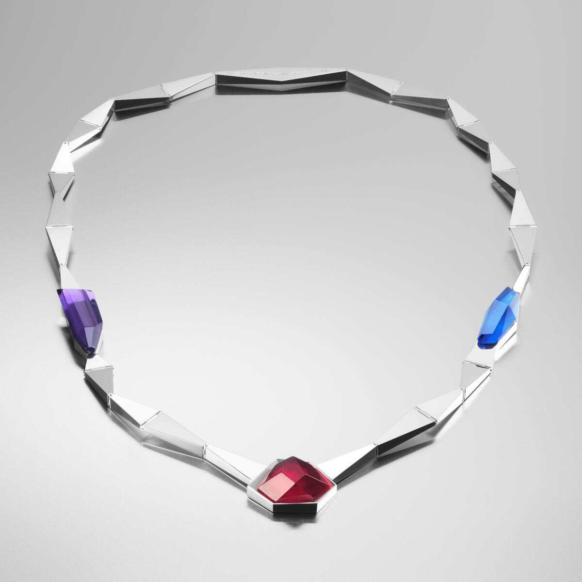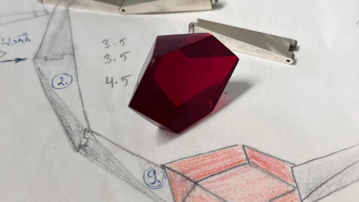 ”Kidemuodot määrittivät myös lasiosien järjestyksen. Ametisti ja safiiri ovat pitkänomaisia, joten niiden paikat ovat luontevasti käätyjen pitkillä osilla, kun taas granaatti on kuutiollisen kidejärjestelmän monitahokas, ja muotonsa vuoksi keskellä niin sanotussa taitekohdassa. Näin kaikki kolme erilaista akatemiaa on mukana tasavertaisesti, hienostuneesti ja viitteellisesti”, Doukas kertoo