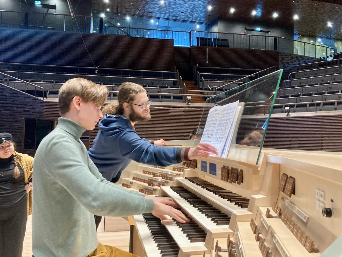 Molemmat olivat ensimmäisten joukossa kokeilemassa mahtipontista soitinta, kun ryhmä kirkkomusiikin opiskelijoita ja opettajia saapui hiljaisen Musiikkitalon autioon konserttisaliin helmikuisena sunnuntaiaamuna.