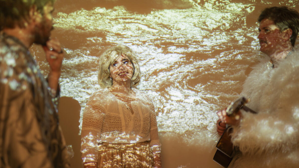 The piece explores the artist’s labor as the three performers reach toward Tove, who in turn reaches toward paradises. The three characters display their intimate relationship with Tove through drag and expressive physicality.