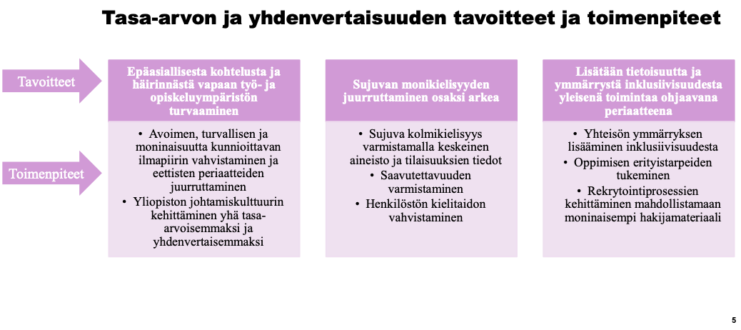 | 2022 | Inklusiivisuuden ymmärryksen lisääminen Sujuvan monikielisyyden vahvistaminen Opetuksen sisältöjen kehittäminen | – Etsitään keinoja monimuotoisuuden parantamiseen eri vähemmistöjen näkökulmasta Monimuotoisuuden ymmärrystä lisääviä työpajoja/keskustelusarjoja – Tasa-arvon- ja yhdenvertaisuuden teemat mukana eri henkilöstökoulutuksissa – Tasa-arvon ja yhdenvertaisuuden teemat mukana opetuksen sisällöissä: valmistelutyö Yliopiston materiaalin ja tiedontuotannon kehittäminen – Opetusmateriaalien saavutettavuuden kehittämisen käynnistys – Yliopiston keskeisten materiaalien ja ohjeiden käännöstyö jatkuu – Suomen- ja englannin kielen henkilöstökoulutusta – Rekrytointiprosessien kehittäminen selvityksen perusteella |