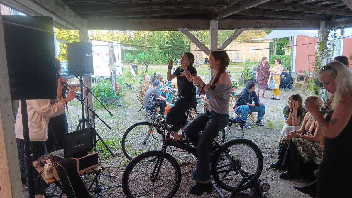 A stage is not the materials it is built of, but the performative situation an artistic practice takes place in. Wherever GaiaStage sets up a stall, it provides a meeting point, an activist Agora, a participatory platform for performers and audience to engage on the subject of energy and its transformation from kinetic, to electric, to kinaesthetic form as an artistic challenge. In practical terms, this means setting up a small sound-system that can be powered from two generator stations for standard bicycles.