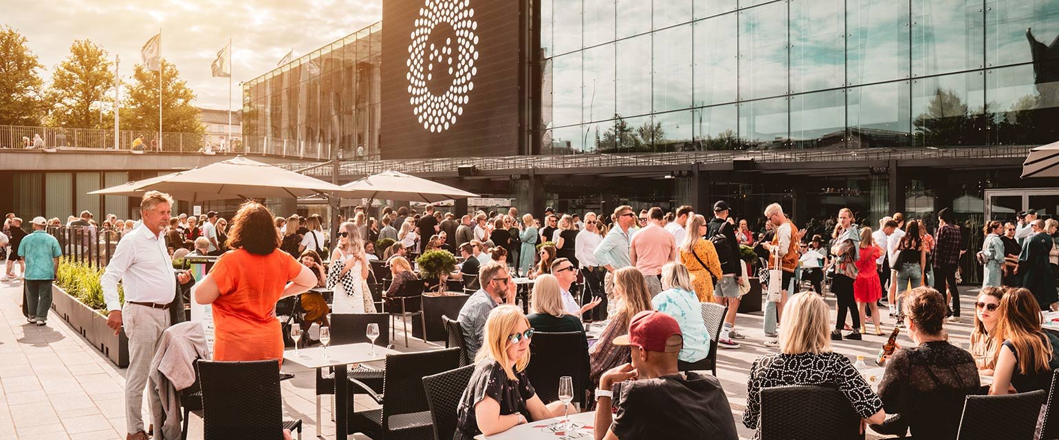 Kom och njut av sommardagarna på Musikhusets terrass! Terrassrestaurangen har två sidor: en täckt sida och en solterrass. Väggarna på den täckta sidan kan öppnas eller stängas beroende på vädret. På solterrassen kan du njuta av sol och värme.