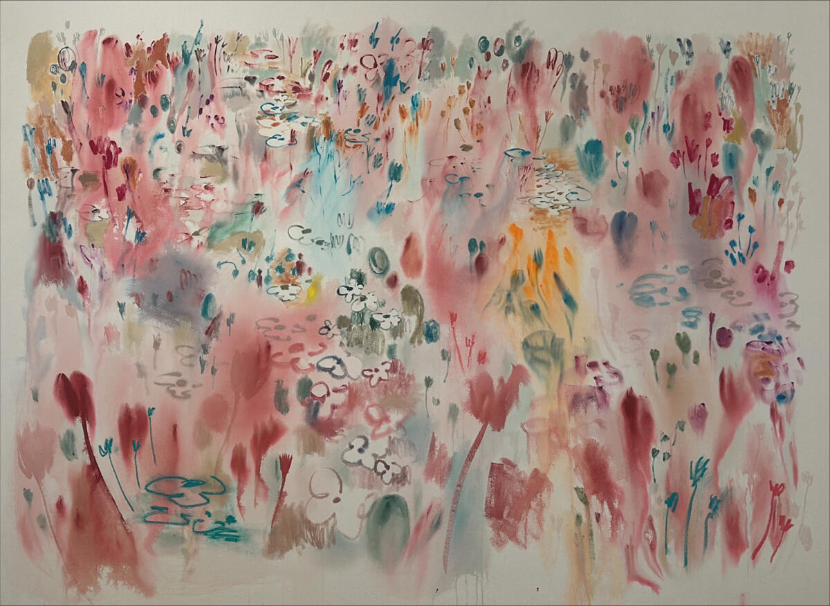 Näyttelyn teosten tyyli liikkuu jossain esittävän ja abstraktin maalauksen välimaastossa. Viimeiset viisi vuotta olen istuttanut mökilleni kukkaniittyjä pörriäisille ja perhosille, ja vähitellen nuo kukat ovat siirtyneet maalauskankaille.
